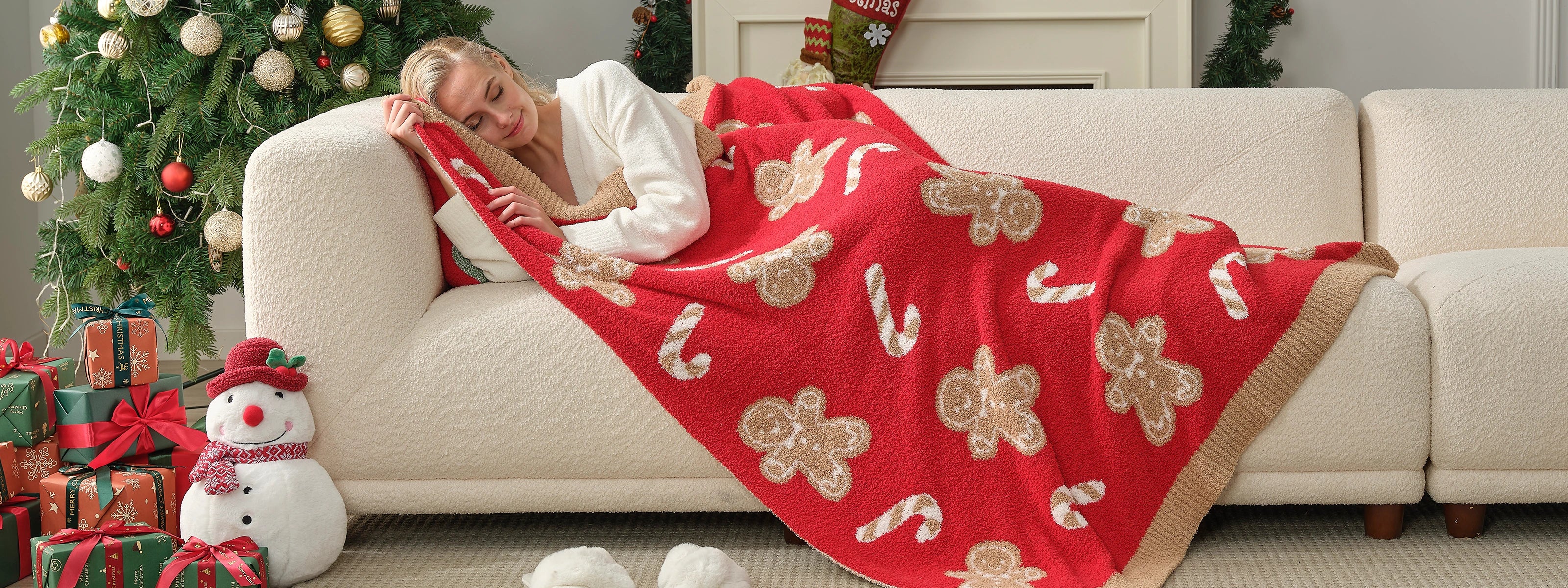 SnugCozy Checkered Feather Yarn Throw Blanket - Xmas Red