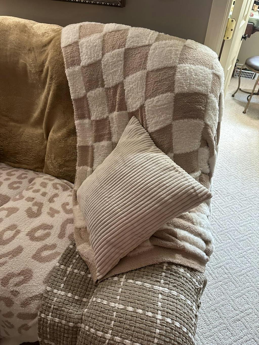 This luxurious blanket combines a trendy checkered pattern with ultra-soft faux fur and feather yarn backing. Perfect for couch cuddling, bed decorating, and adding stylish warmth to any room. Multiple colors available.