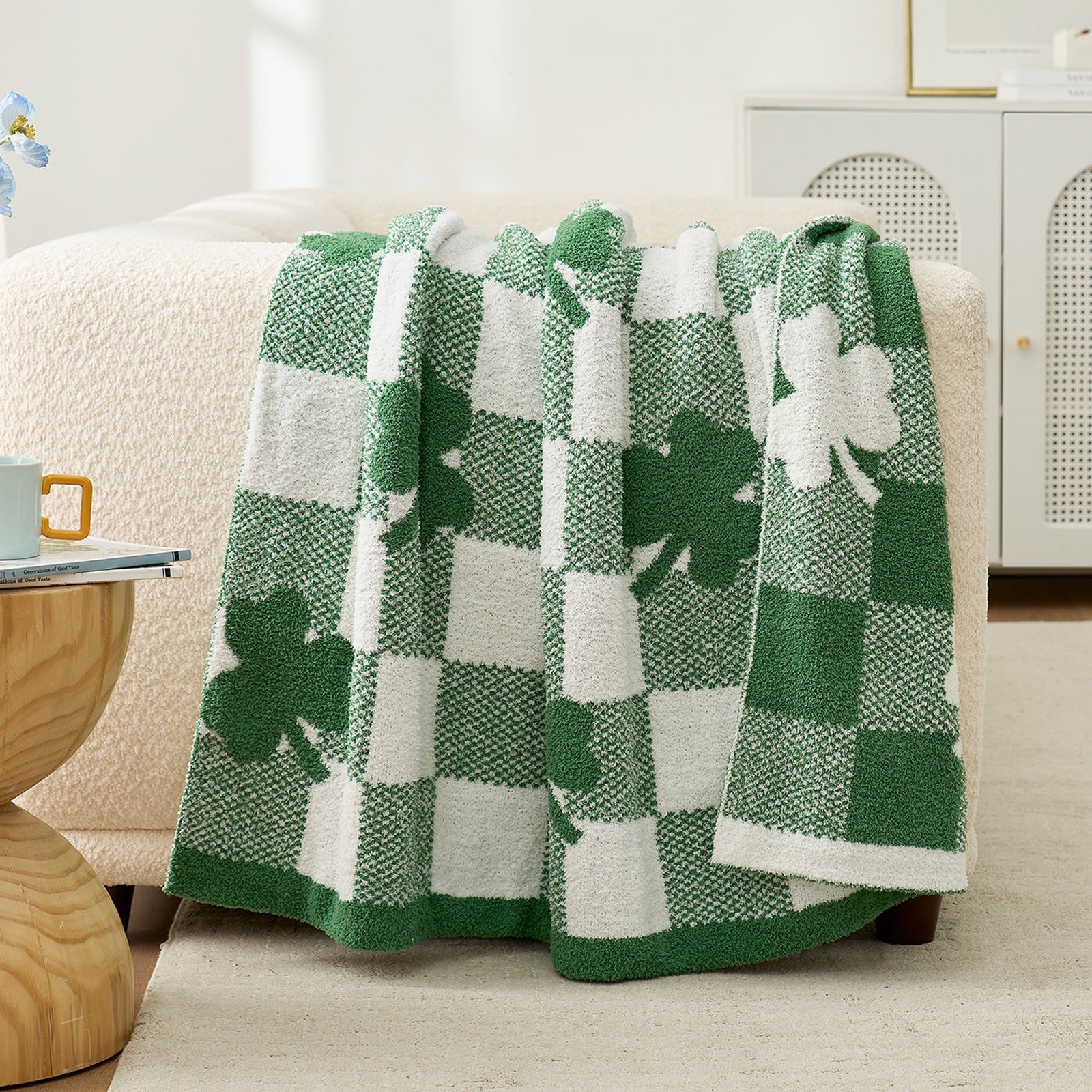 SnugCozy Lucky Shamrock Feather Yarn Knit Throw Blanket